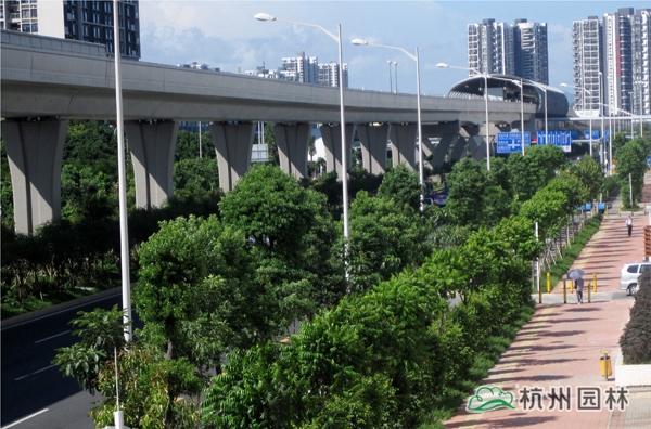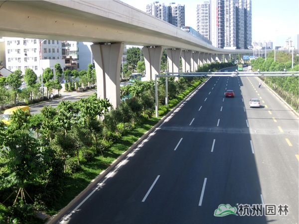 該工程位于國道205深圳段龍崗區(qū)地鐵三號(hào)線愛聯(lián)地鐵站至坪地與惠州市交界處,施工內(nèi)容包括綠化種植、綠化噴灌與管道安裝等。植物配置遵循適地適樹的原則,并充分考慮與城市風(fēng)格的吻合,兼顧多樣性和季節(jié)性,通過多層次、多品種的搭配,營(yíng)造出處處有綠葉、無處不飛花,一路風(fēng)景變化萬千的城市景觀帶。