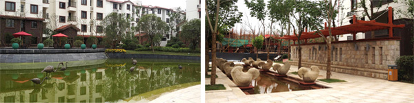 在紫荊東郡小區(qū),水景隨處可見,從主入口兩側(cè)近50米的景觀橋水景,到入口正前方一個(gè)大型的石雕噴泉,再到小區(qū)里面幾條主干道交匯的十字路口的小型地面噴泉,中心水景上的圓形石雕噴泉,特別是不遠(yuǎn)處的動(dòng)物噴泉雕塑,只只鶴低頭凝思,細(xì)長(zhǎng)的水流從鼻端的出水口處流出,落入下方的水池里,更是格外引人注目。“這些水景小品具有的藝術(shù)特性與審美效果,加強(qiáng)了整個(gè)景觀環(huán)境的藝術(shù)氛圍,成為讓空間環(huán)境生動(dòng)起來(lái)的關(guān)鍵因素,在提高小區(qū)藝術(shù)品質(zhì)和景觀形象的同時(shí),更給人們帶來(lái)美的享受。”楊經(jīng)理如是說(shuō)。
