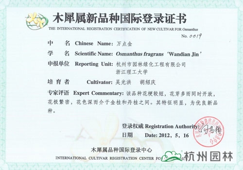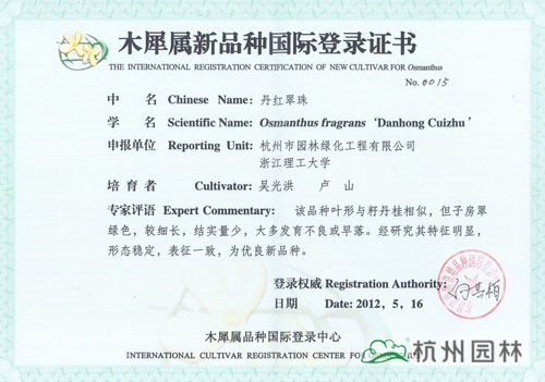 近日,由杭州市園林綠化工程有限公司與浙江理工大學聯(lián)合研發(fā)的“丹紅翠珠”、“杭州丹桂”、“杭州黃”、“菊瓣”、“萬點金”5個桂花新品種獲得木犀屬新品種國際登錄證書。截止目前,杭州園林已經(jīng)有12個桂花品種獲得此項國際登錄權,充分展示了企業(yè)在桂花研究方面的突出成績。
