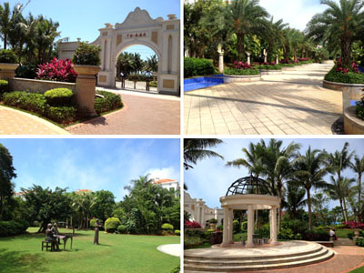 走進(jìn)森海灣,紅瓦白墻、單邊回廊的建筑設(shè)計,與郁郁蔥蔥的植物一起,構(gòu)建了一個海灣童話城堡世界,營造出閑適、愜意、溫馨、雅致的居住氛圍。據(jù)項(xiàng)目負(fù)責(zé)人葉偉華介紹,作為一個高端住宅區(qū),森海灣對園林景觀的要求比較高,小區(qū)以中軸景觀帶為主景,設(shè)有游泳池、休閑草坪、疊水等,種植大王椰、霸王棕、鳳凰木、重陽木、中東海棗、老人葵等大樹襯托整個中央主景。各處庭院則選擇豐富多彩的樹種,采用不同的手法布局與建筑完美融合,透露出精細(xì)的西班牙情調(diào),用簡單詮釋浪漫,點(diǎn)綴悠閑的度假生活,使整個園林充盈著濃郁的熱帶風(fēng)情。
