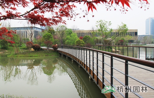 從濱江區(qū)江虹路的西入口處走進華為杭州生產(chǎn)基地,首先映入眼簾的是廣場上大小不一的花池,一棵棵銀杏、香樟、桂花生長得郁郁蔥蔥,昭示著無限的生機與活力。腳下的鋪裝,一邊是菠蘿格防腐木,一邊是規(guī)則的花崗巖,一“軟”一“硬”,相映成趣,蜿蜒延伸,直通前方的人工湖。清澈的湖水,在夏日陽光的照耀下,波光粼粼,偶爾一陣風(fēng)來,一圈圈的漣漪蕩漾,整個湖面都動了起來,讓人忍不住加快腳步,去一睹前方的美景。這就是華為杭州二期生產(chǎn)基地景觀綠化分包工程一標(biāo)段的現(xiàn)場景觀,該工程由杭州市園林綠化股份有限公司承建,曾榮獲2013年度浙江省園林綠化工程安全文明施工標(biāo)化工地。