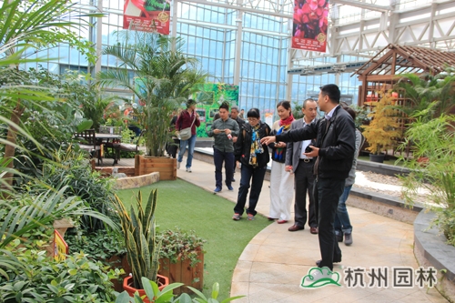 第二天,考察團(tuán)在杭州市園林綠化股份有限公司總裁張炎良、副總裁丁旭升的陪同下參觀了畫境·青山湖花園中心。該花園中心是一個(gè)集園藝產(chǎn)品研發(fā)、展示和推廣的現(xiàn)代園林高新技術(shù)平臺,致力于打造庭院設(shè)計(jì)、咨詢、建造、養(yǎng)護(hù)等各類功能綜合的一站式園藝服務(wù)中心。項(xiàng)目有近3000畝配套生產(chǎn)基地,12000平米研發(fā)與生產(chǎn)溫室,以及室內(nèi)情景展示區(qū)、園藝展示區(qū),室外陳列展示區(qū)、應(yīng)用展示區(qū)等多個(gè)功能區(qū)塊。其中,用于室內(nèi)園藝展示的4000平方米的展覽溫室,引進(jìn)荷蘭PRINS溫室技術(shù),實(shí)現(xiàn)對溫度、光照等全智能控制,是一個(gè)技術(shù)含量極高的節(jié)能、環(huán)保型現(xiàn)代溫室。