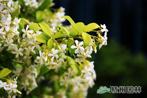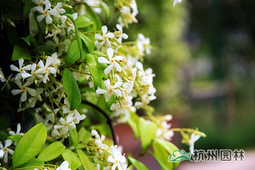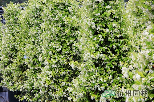 意大利白花絡(luò)石藤(Rhyncospermum jasminoides),俗稱風(fēng)車茉莉,為夾竹桃科的常綠藤本,莖赤褐色,幼枝被黃色柔毛長(zhǎng),有氣生根。常攀緣在樹木、巖石墻垣上生長(zhǎng),是一流的藤蔓植物,四季常綠。開花期在夏季,5月進(jìn)入盛花期,開花量極大,有茉莉的香味,聞起來沁人心脾。