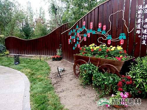 本處已有木制景墻做背景,花境施工前已在幾個(gè)節(jié)點(diǎn)放置了花車、木桶等,并栽植了一棵較高大的紅皮云杉,為花境營(yíng)造創(chuàng)造了良好的條件。結(jié)合景墻上的文字、地圖,以“陸上絲綢之路”文字為分界點(diǎn),營(yíng)造“絲?路”、“絲?念”兩組花境。