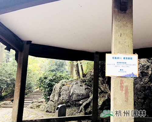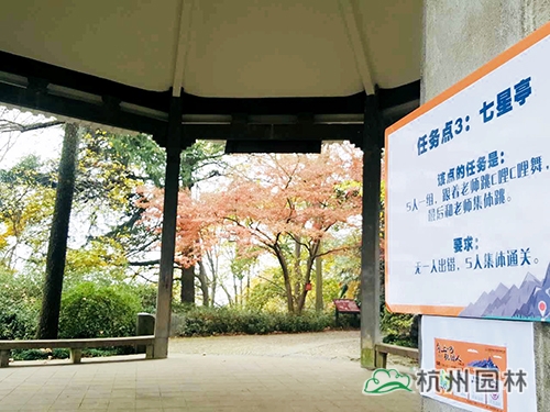 本次活動(dòng)的終點(diǎn)為玉皇山頂?shù)摹敖挥[閣”。玉皇山是杭州絕佳的觀秋景高地,站在山頂,可俯瞰杭州全城,八卦田的神秘、西湖的絢麗等盡收眼底;山上則是古樹參天,紅葉似火,黃葉賽金,彩林岑巒疊峰,如入畫里。大家從玉皇山北門上山,途經(jīng)林海亭、老玉皇宮、櫻花地、紫來(lái)洞天、七星亭,最后到達(dá)山頂?shù)摹敖挥[閣”。此次登山途中設(shè)立了3個(gè)任務(wù)點(diǎn),參加活動(dòng)人員需要完成相應(yīng)任務(wù),才能蓋章通關(guān)。