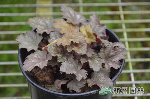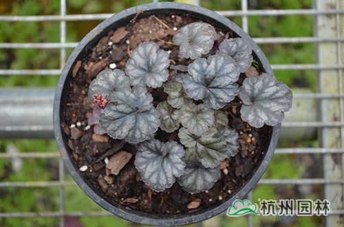 礬根又名小花腎形草,英文名為“Alum root”(因根部不規(guī)則膨脹而來(lái)),因此在引入中國(guó)的時(shí)候被翻譯成了“礬根”。礬根葉色繁多,且葉色會(huì)隨著季節(jié)、環(huán)境、溫度和光照條件的變化而改變。例如,‘蜜桃黃’在春天的時(shí)候,葉子展現(xiàn)出細(xì)膩的銀色光澤,成熟的葉片顏色會(huì)呈現(xiàn)紫色并略帶玫瑰紅;‘赤砂巖紅’的葉色會(huì)從桃紅色變?yōu)榱零~黃色,再變?yōu)榫G色帶有琥珀色;‘貴族紫’葉子的顏色會(huì)保持穩(wěn)定的紫色,冬天的葉子會(huì)變成銀色。