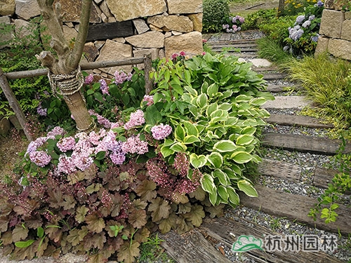 多彩的礬根與玉簪搭配,營(yíng)造出色彩明快的林下地被景觀