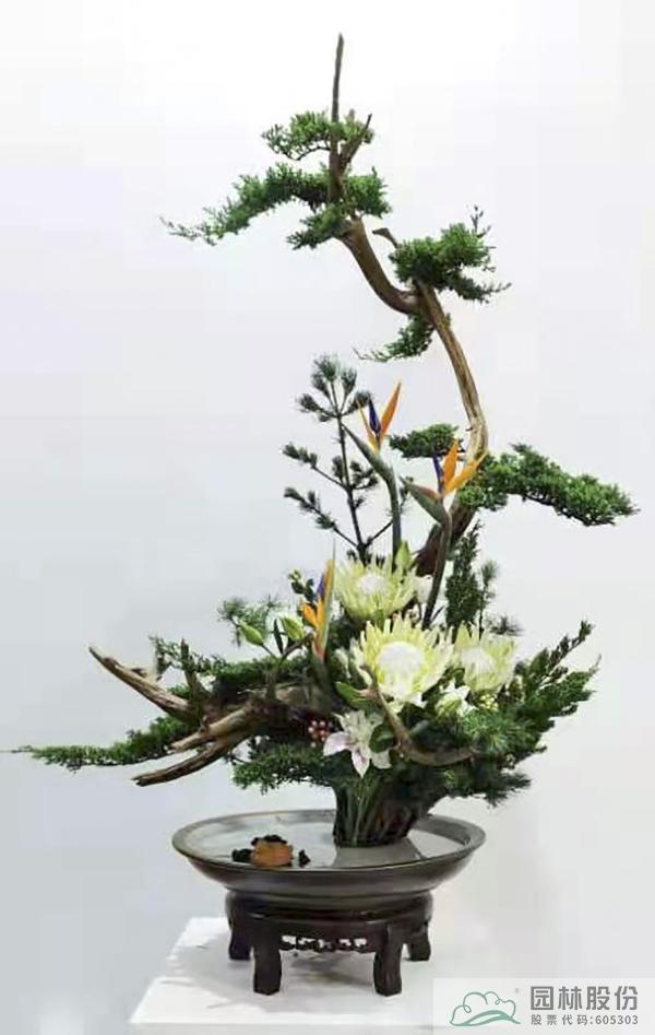 另有極富意境的《云崖青嶠》插花作品,選崖柏、龍柏、鋪地柏、五針?biāo)伞⒌刍驶ā⒅匕臧俸匣ā⒎凵桶咨鸾z桃、天堂鳥(niǎo),以成云崖青嶠之作。云為雅意,崖寓故訓(xùn),青色入觀,嶠在畫外。如此,松風(fēng)若過(guò),花開(kāi)舒卷,青紅果結(jié),臨水照影。清澗之曲,碧松之陰,相映成趣,著手成春矣。