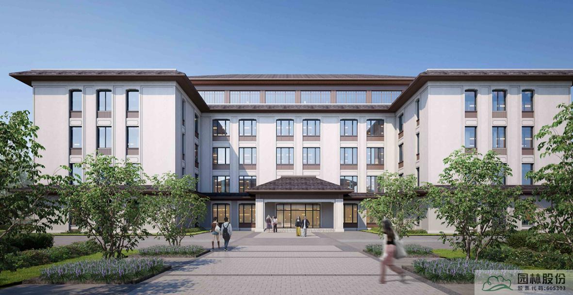 建筑風(fēng)格以新中式為主,在與朔西湖大景區(qū)的風(fēng)格相協(xié)調(diào)下,同時(shí)兼顧了使用功能。東西向的校園主軸線,從主入口廣場起,經(jīng)整齊的樹陣、升旗臺(tái)、至綜合教學(xué)樓與綜合服務(wù)中心圍合的中心廣場,并向東延伸到宿舍區(qū),是校園中最主要的視廊,大氣、莊重。