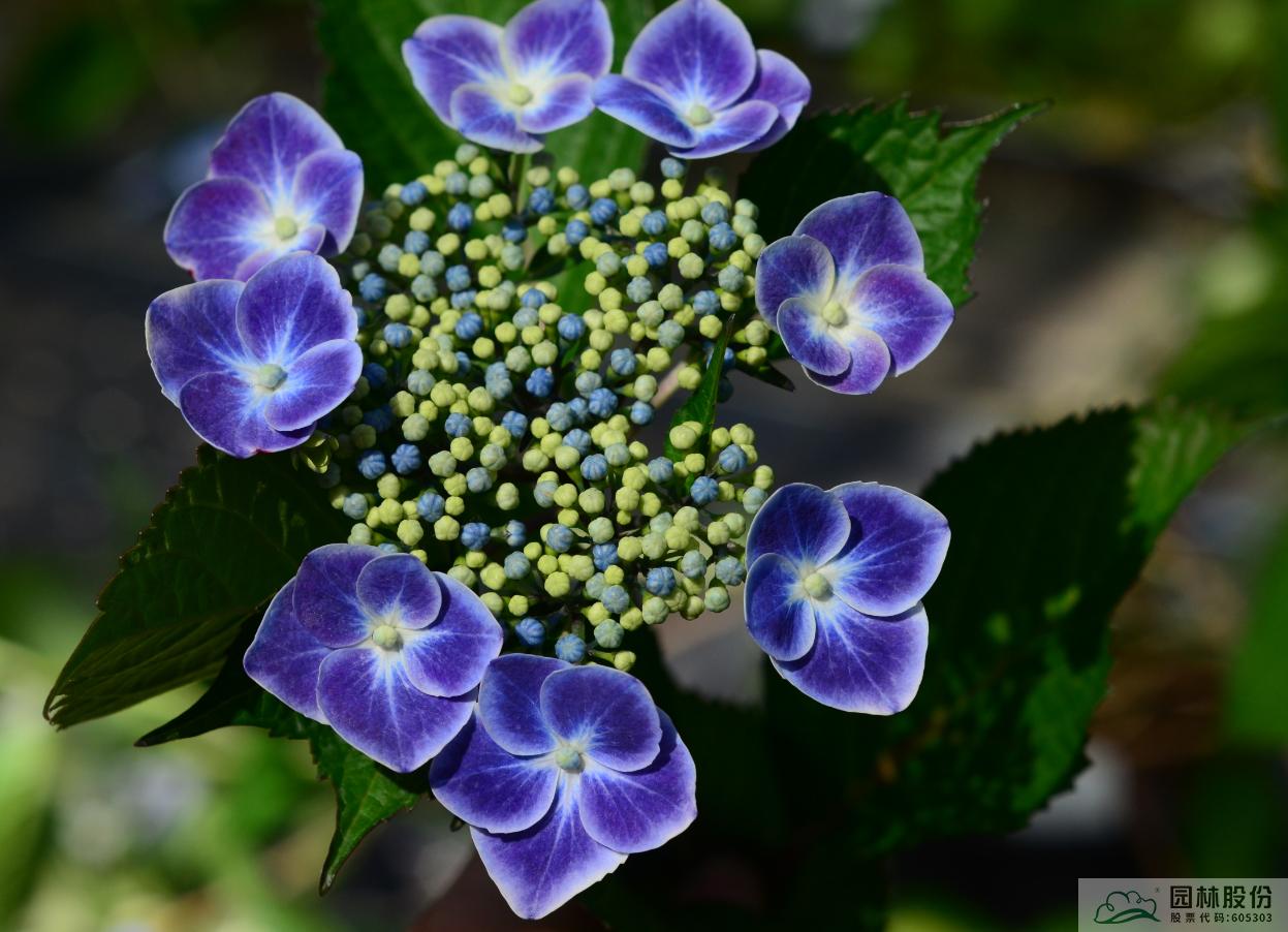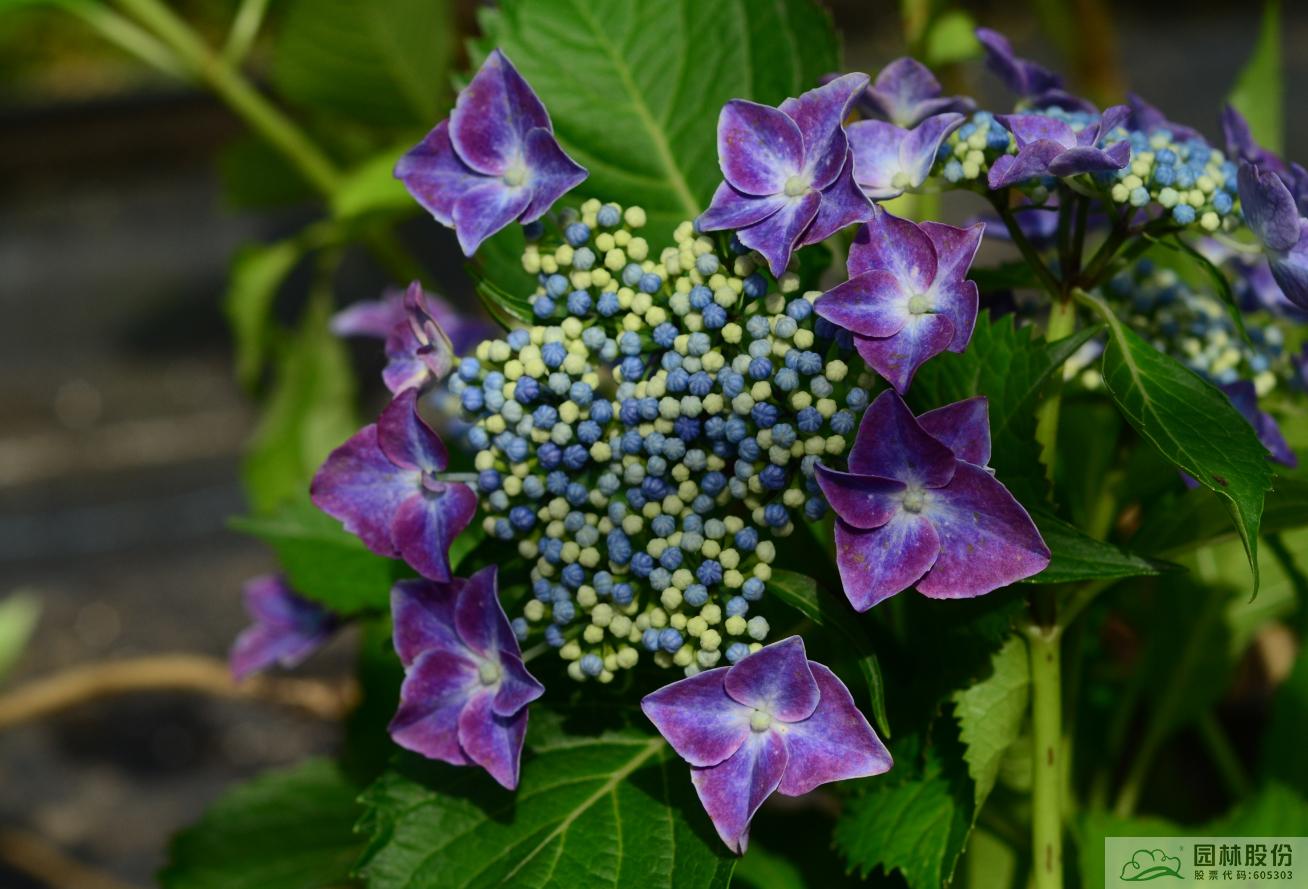 大葉繡球‘夢(mèng)幻星空’:傘房狀聚傘花序盤狀,高度2~4cm,直徑10~12cm,上海及杭州5月中下旬開花,可延續(xù)至6月下旬;可孕花花瓣藍(lán)色;不孕花萼片先端白色至淺藍(lán)色中部藍(lán)色至紫色基部白色;花色夢(mèng)幻,花型飄逸,適合家庭園藝和工程。