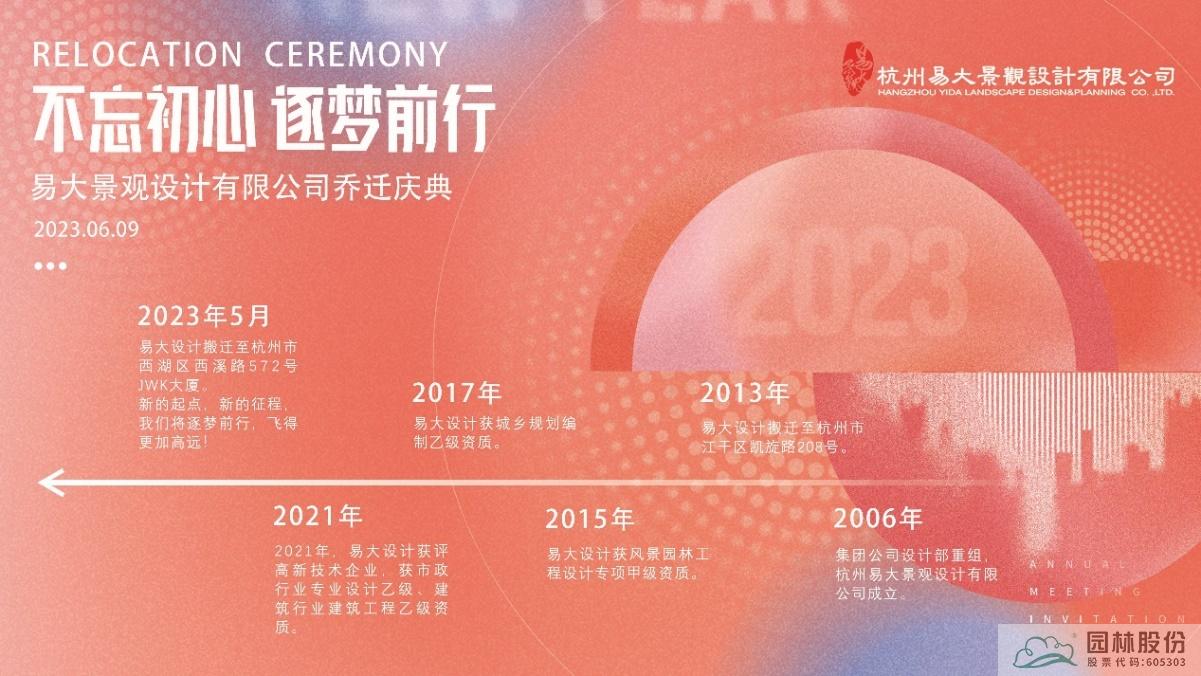 六月是花開的季節(jié),摯愛的季節(jié),感恩的季節(jié),在這欣欣向榮的六月,我們相聚一起,熱烈祝賀杭州市園林綠化股份有限公司下屬杭州易大景觀設計有限公司喬遷至杭州市西湖區(qū)西溪路JWK大廈。園林股份總裁張炎良、副總裁李壽仁等領導參加了喬遷慶典。