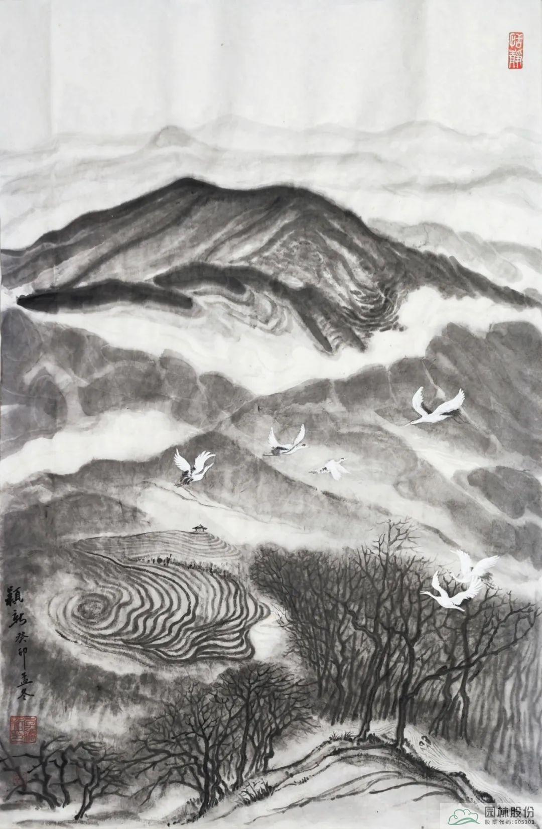 其中,杭州市園林綠化股份有限公司辦公室主任李穎新以徑山美景為創(chuàng)作內(nèi)容的書畫作品成功入選前20名。作品以杭州徑山及國家級美麗休閑鄉(xiāng)村-小古城村的自然景觀、鄉(xiāng)村風(fēng)情、茶園風(fēng)貌、翩翩白鷺等作為創(chuàng)作素材,主要表達(dá)在新時代背景下,隨著鄉(xiāng)村振興戰(zhàn)略的全面推進(jìn),一幅幅人與自然和諧共生的美麗畫卷正在神州大地徐徐展現(xiàn)。圖中山巒起伏、云霧氤氳、茶園連綿、溪水潺潺、白鷺紛飛……共同繪就一幅意境唯美的鄉(xiāng)村風(fēng)情畫卷,留下一段令人念念不忘的鄉(xiāng)愁記憶。