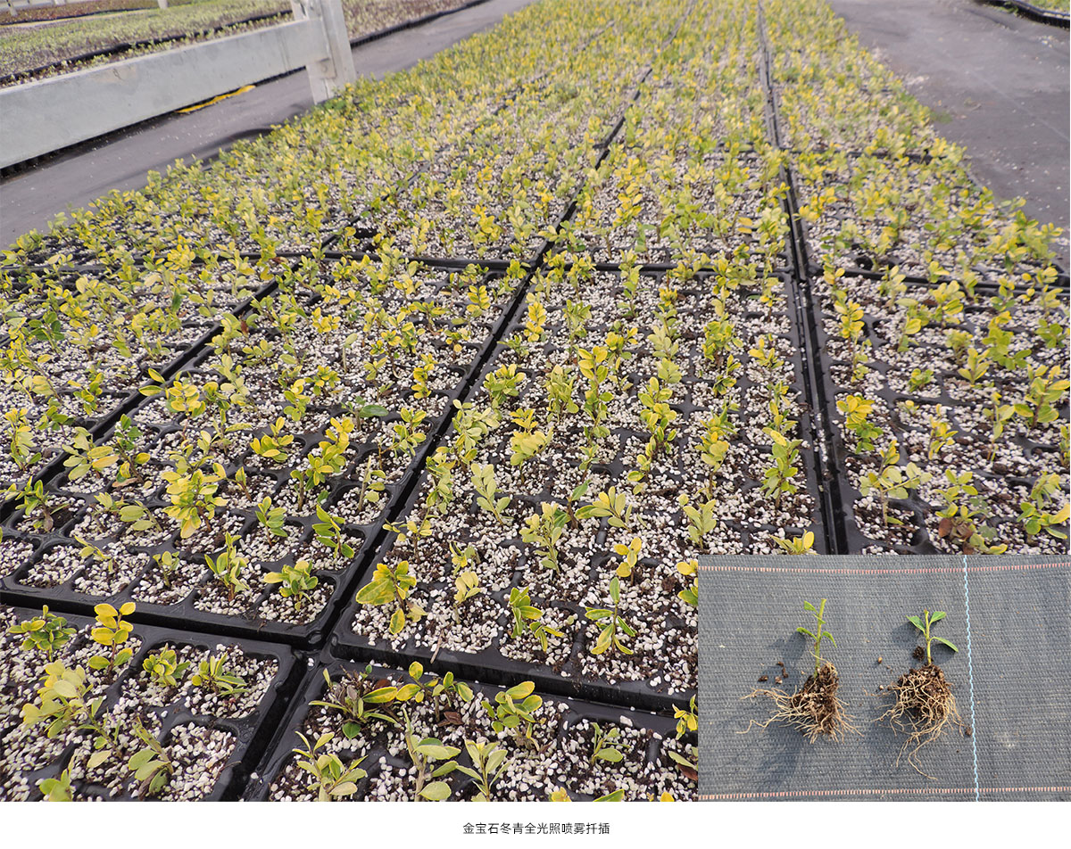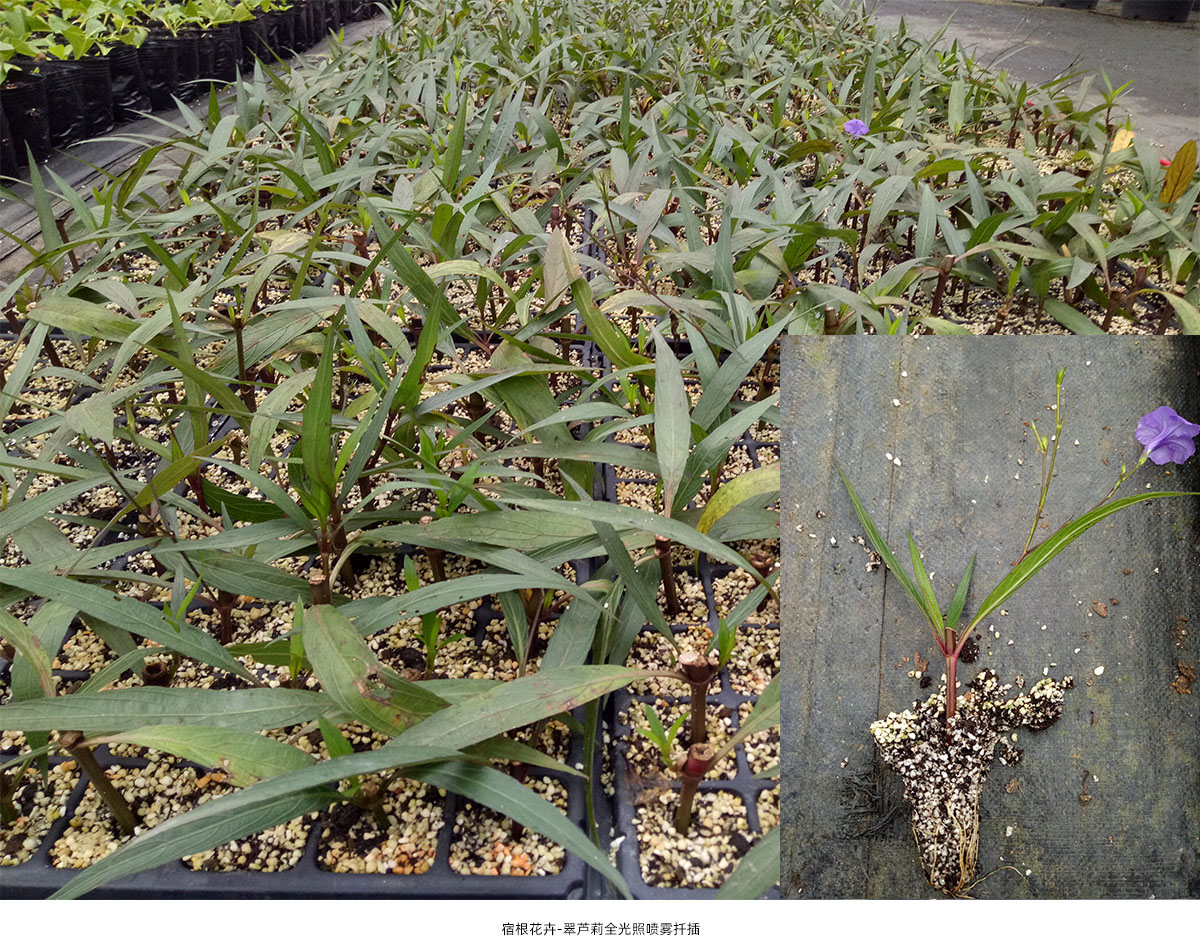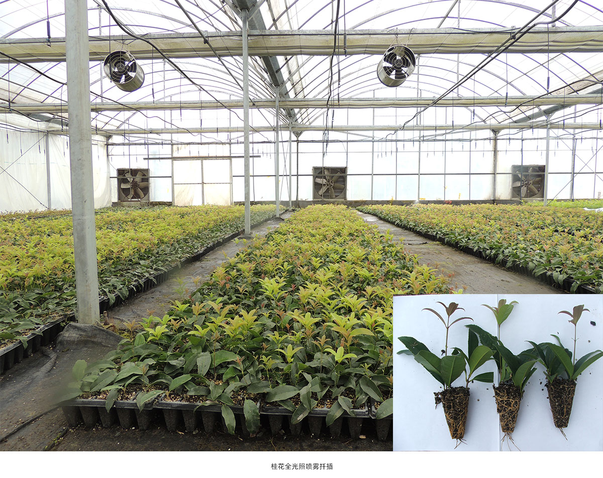 全光照噴霧扦插技術(shù)具有生根期短、成活率高和操作簡單等優(yōu)點。研究院已建立了桂花、冬青、降香黃檀、新優(yōu)宿根植物等數(shù)百種植物的全光照噴霧扦插技術(shù)體系,年度育苗量200多萬。